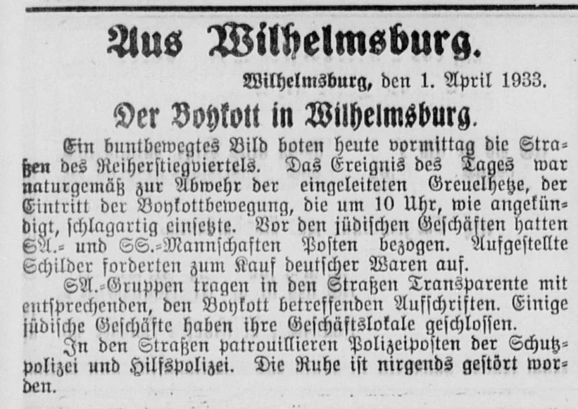 Am 1. April 1933 erschien ein Bericht in den Harburger Anzeigen und Nachrichten, nach dem bereits 57 Geschäfte boykottiert werden.